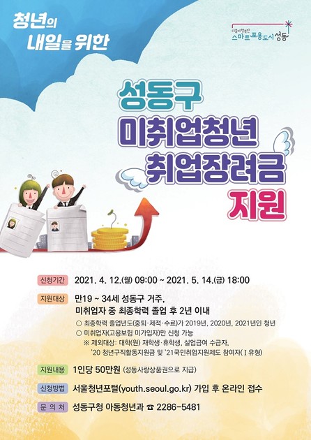 2. 지원대상: 만19세~34세 성동구 거주자, 미취업자 중 최종학력 졸업 후 2년 이내 청년