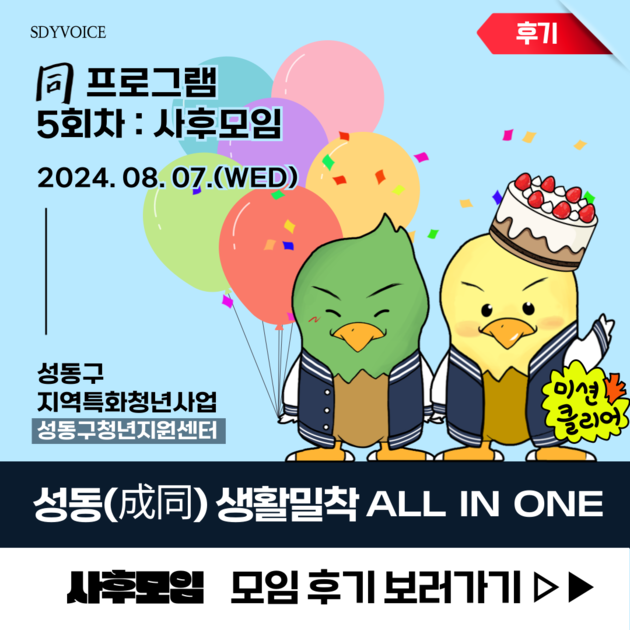 [지역특화 마지막 : 사후모임 후기]안녕하세요? 성동구청년지원센터입니다 :)이번 2024년 무더운 여름,7월 3일에 시작한 '성동(成同) 생활밀착 all in one' : 同 프로그램이 8월 7일 사후모임편을 끝으로 막을 내렸는데요,매 회차마다 다양한 프로그램을 통해 참여 청년분들의 활동을 지원하며, 프로그램 뿐만이 아닌 자기주도형 목표설정 온라인 챌린지를 통해 작은 변화를 이뤄내는 시간들을 가졌습니다 :)이번 사후모임은 '프로그램 완주!...