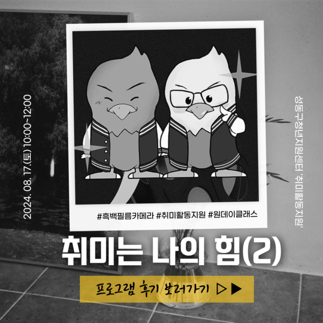 [프로그램 후기]안녕하세요? 성동구청년지원센터입니다 :)이번 8월 17일 토요일,성동구청년지원센터에서는 청년생활밀착지원사업 '취미활동지원'으로,지난 우천으로 진행하지 못했던 프로그램인 [흑백 필름카메라 원데이클래스]를 이번에 진행했습니다!금번 프로그램은 뜨거운 햇살과 강렬한 햇빛이 내리쬐는 이 계절이 유독 따갑고 힘들게만 느껴져 이 계절을 아름답게 추억하고 기록하고자, 강렬한 햇살과 잘 어울리는 흑백 필름카메라 원데이클래스를 기획하게 되었...