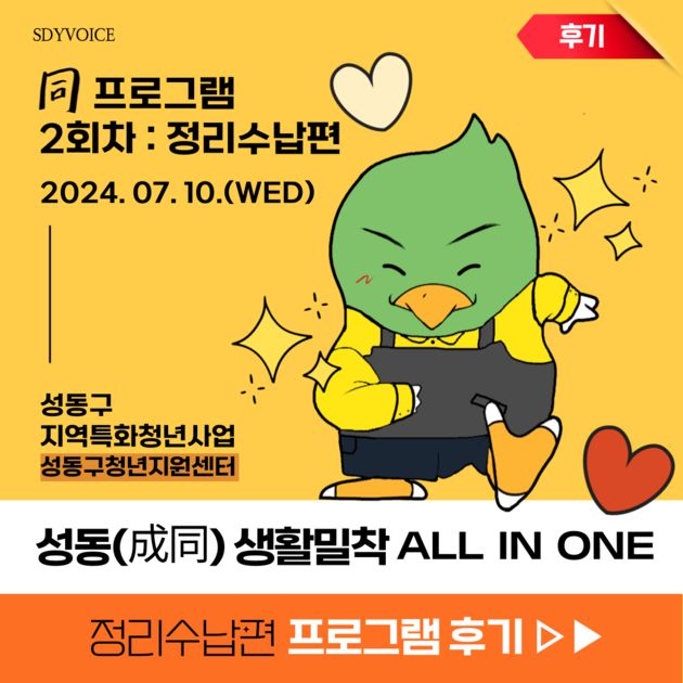 [지역특화 2회차 : 정리수납편 후기]안녕하세요? 성동구청년지원센터입니다.이번 7월 10일 수요일 '성동(成同) 생활밀착 all in one' : 同 프로그램의 두 번째 프로그램인 정리수납편을 진행해 후기를 가져왔습니다 XD이번 정리수납편에서는,[주거환경 개선을 위한 정리교육 특강]이라는 주제로,'각나오는 이선생님' 이은주 대표님과 함께하였는데요!정리를 잘 할수 있는 핵심 키워드 3가지를 필두로,공간별 정리법도 세분화하여 배워보고, 효과적...