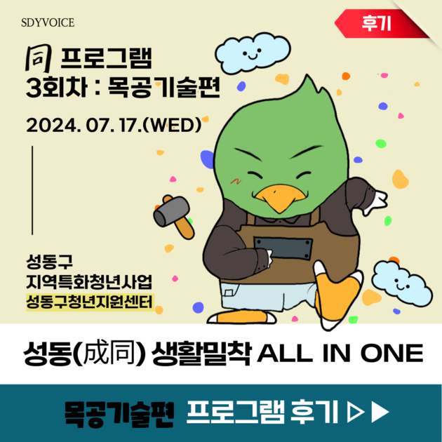 [지역특화 3회차 : 목공기술편 후기]안녕하세요? 성동구청년지원센터입니다.이번 7월 17일 수요일 '성동(成同) 생활밀착 all in one' : 同 프로그램의 세 번째 프로그램인 목공기술편을 진행해 후기를 가져왔습니다 XD이번 목공기술편에서는,[스툴 만들기]이라는 주제로,'우드어스' 양병주 이사님과 함께하였는데요!공구에 대한 사용법 기초교육을 시작으로,2인1조로 함께 도와주며 직접 만들어 보고, 사포질로 마무리까지!다양한 활동을 통해 참...