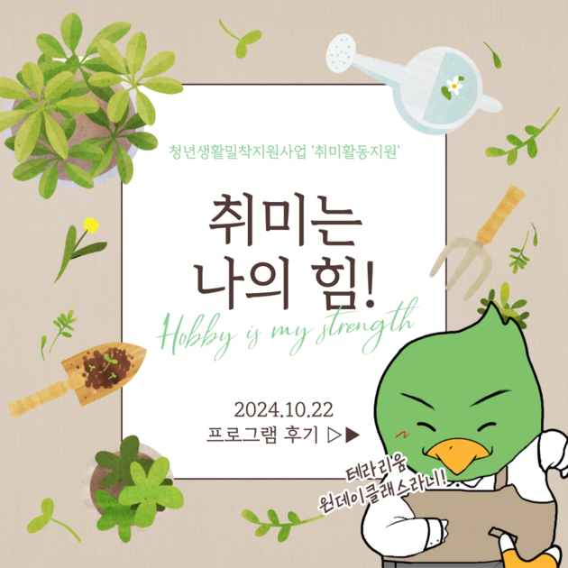 [프로그램 후기]안녕하세요? 성동구청년지원센터입니다 :)이번 10월 22일 화요일,성동구청년지원센터에서는 청년생활밀착지원사업 '취미활동지원'으로,싱그러움이 다 가는 계절 겨울에 맞춰 [테라리움 원데이클래스]를 진행했습니다!지난번 취미활동지원 프로그램으로 뜨거운 여름을 아름답게 기록했다면,금번 프로그램은 나만의 싱그러움을 간직한 채 자칫 삭막할 수도 있는 겨울을 맞이하고자 진행하게 되었는데요!센터에서도 진행해보지 못했던 프로그램이라, 이번...