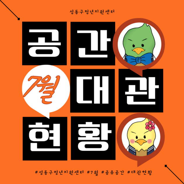 안녕하세요, 성동구청년지원센터입니다 :)무더위가 지속되는 이번 7월,점점 더 많은 청년분들이 센터를 이용해주고 계신데요~!이번 7월에는 총 22번의 대관과(158명), 개인 이용자 분들이(94명) 이용해주셨습니다 :D저희 성동구청년지원센터 청년공유공간 '청공공'은 언제나 다양한 용도로 사용할 수 있습니다-!관내 청년 분들의 많은 이용 부탁드립니다 :)※ 대관 관련 문의는 센터 카카오톡채널 1:1 대화 혹은 센터 유선 전화로 문의 주시면 친...