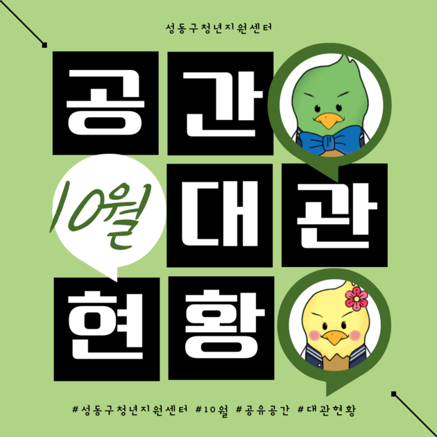 [10월 청년공유공간 후기]안녕하세요, 성동구청년지원센터입니다 :)드디어 반팔의 계절은 가고, 긴팔의 계절이 돌아온 10월!이번 10월에도 많은 청년분들이 성동구청년지원센터 공유공간을 대관해주셨는데요.이번 10월에는 총 14번의 대관과(98명), 개인 이용자 분들이(84명) 이용해주셨습니다 :D저희 성동구청년지원센터 청년공유공간 '청공공'은 언제나 다양한 용도로 사용할 수 있습니다-!관내 청년 분들의 많은 이용 부탁드립니다 :)※ 대관 관...