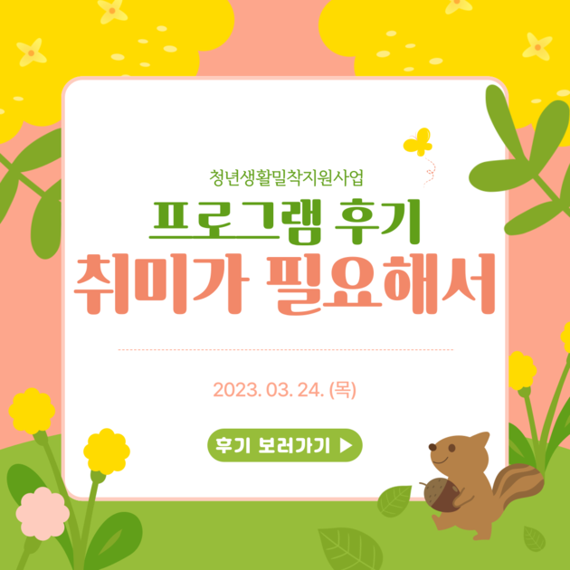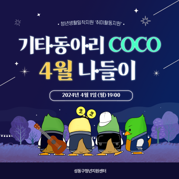센터소식* 코코 4월 나들이 후기안녕하세요 :) 성동구청년지원센터입니다.지난 4월 1일, 센터 기타동아리 'coco'가 4월 나들이를 다녀왔는데요!봄이 옴과 동시에 기타메고 다같이 뚝섬유원지에서의 나들이가 얼~~마나 재밌었는지, 많은 동아리원 분들이 참여주셨답니다 :)기타동아리 'coco'는 상시 모집 진행중이니, 관심있는 분들은 인스타그램 @somoim_coco DM 혹은, QR코드 스캔 후 신청서를 작성해주시면 되겠습니다 :)앞으로도 기타동아...